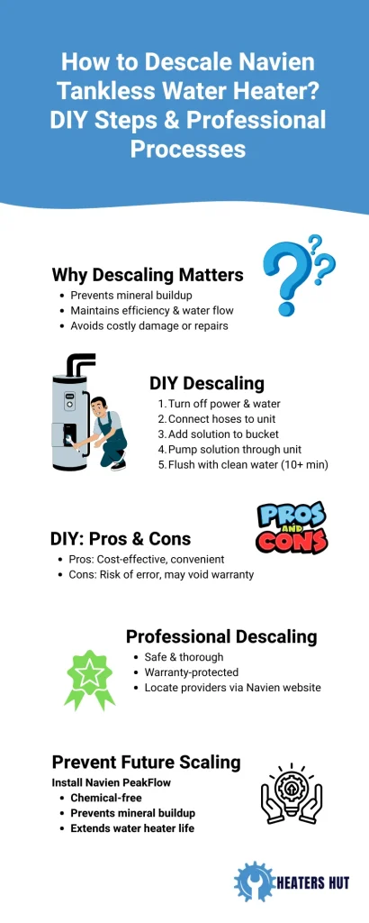 Always prioritize safety and follow the manufacturer’s directions when using chemicals. You can find a more detailed walkthrough in our Navien tankless water heater descaling guide.