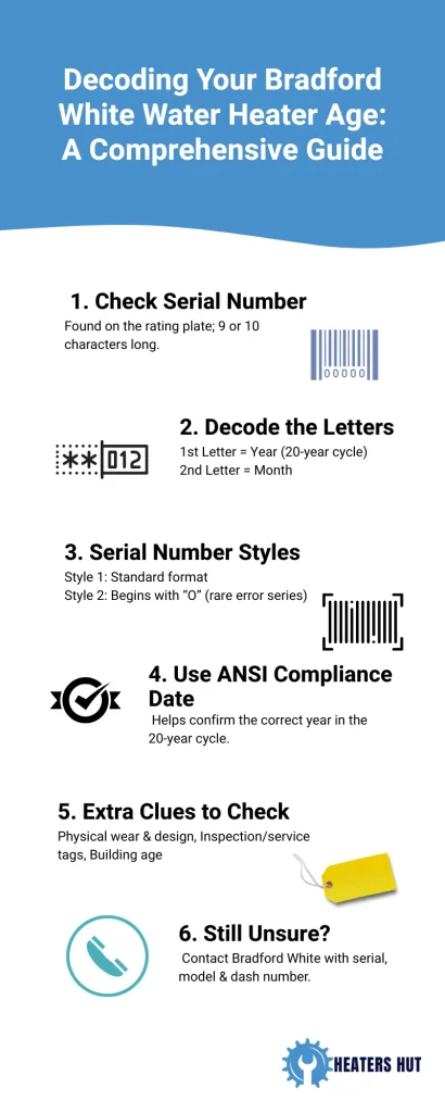Following the steps outlined in this guide, you can easily decode your Bradford White water heater age and plan for maintenance, repairs, or replacement accordingly. knowing how old your Bradford White water heater is can help you better plan for maintenance, repair, or getting a new one. This guide will help you determine its age using the serial number. If you need further assistance, just contact Heaters Hut.