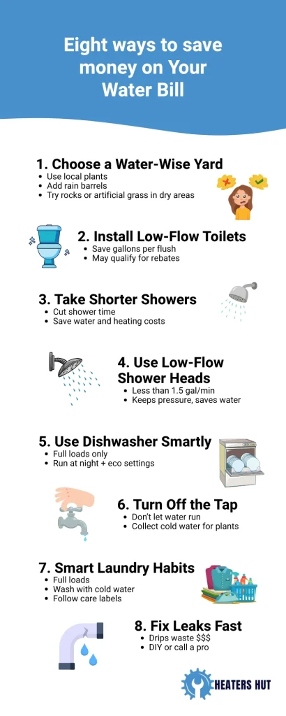 In simple terms, you can save money on your water bill by using plants that like your area, collecting rainwater, and using low-water options for your yard if you live in a dry place.
