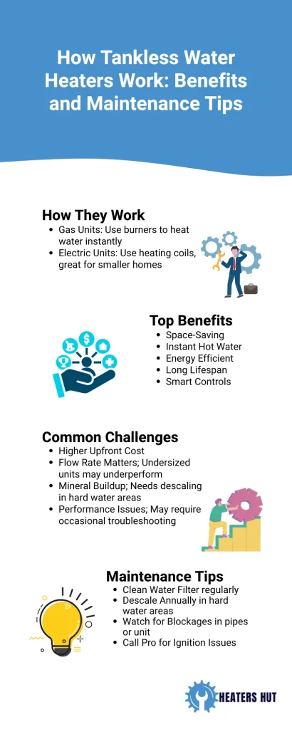 Tankless water heaters are a remarkable innovation that offers instant hot water and energy efficiency. However, they come with challenges, including proper sizing, maintenance, and occasional troubleshooting. By understanding how a tankless water heater works and following the maintenance tips in this guide, you can consistently enjoy the benefits of hot water while minimizing potential problems. If you ever experience continuous issues with your tankless water heater, don’t hesitate to contact a professional plumber for help. With the proper knowledge and care, your tankless water heater can provide reliable hot water for years. For more helpful information, visit Heaters Hut.