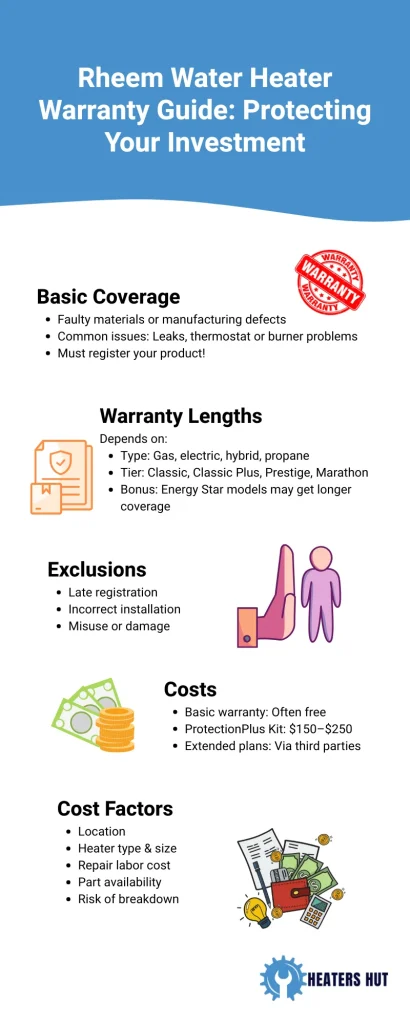 The price of Rheem water heater warranties can be different. When you buy a water heater, you often get a basic warranty for free. But if you want more coverage, you can choose to pay extra for a ProtectionPlus warranty kit. And if you want even more protection, you can buy extended warranties from other companies that give you even more coverage.